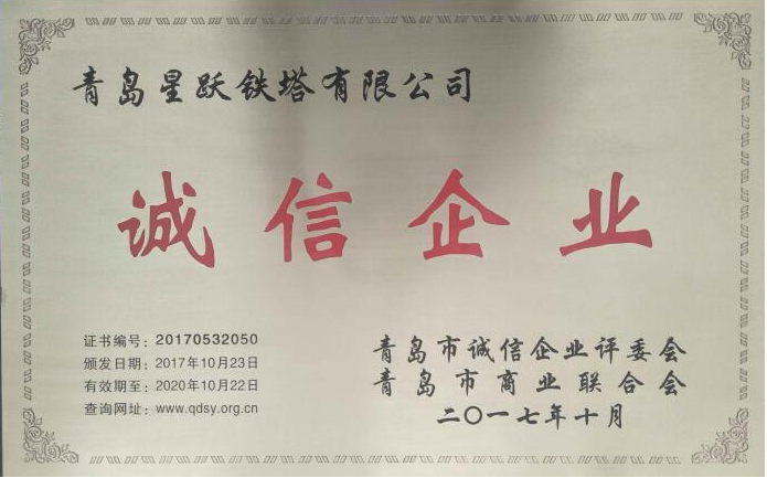 2017年度“青島市誠(chéng)信企業(yè)”評(píng)選活動(dòng)由青島市商業(yè)聯(lián)合會(huì)主辦。經(jīng)過(guò)深入宣傳發(fā)動(dòng)、企業(yè)自薦自評(píng)、相關(guān)部門(mén)和行業(yè)協(xié)會(huì)推薦、評(píng)委會(huì)辦公室初步審核、評(píng)委會(huì)評(píng)審、社會(huì)公示等六個(gè)評(píng)段的工作,青島星躍鐵塔有限公司等60多家企業(yè)被評(píng)為2017年“青島市誠(chéng)信企業(yè)”。